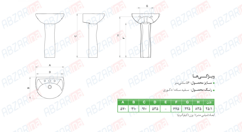 ویژگی های روشویی چینی کرد ورونیکا ۵۶