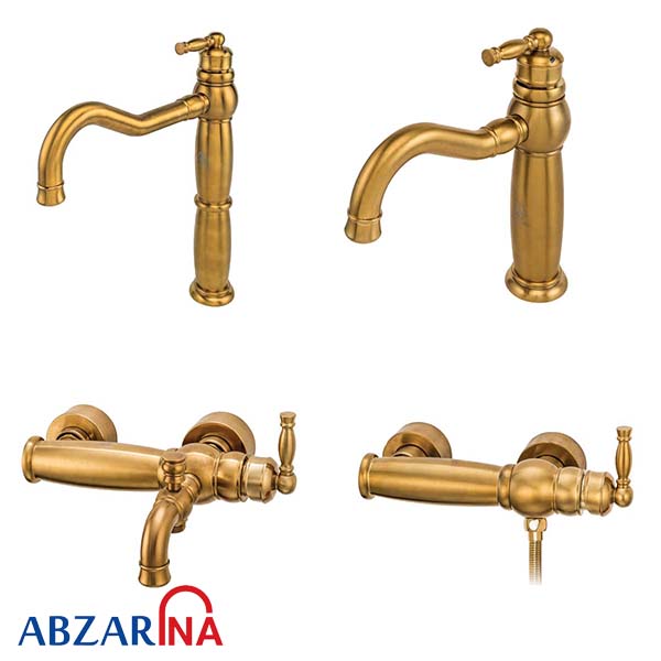 ست شیرآلات آنتیک شامل شیر روشویی، شیر توالت، شیر دوش و شیر ظرفشویی ست.
