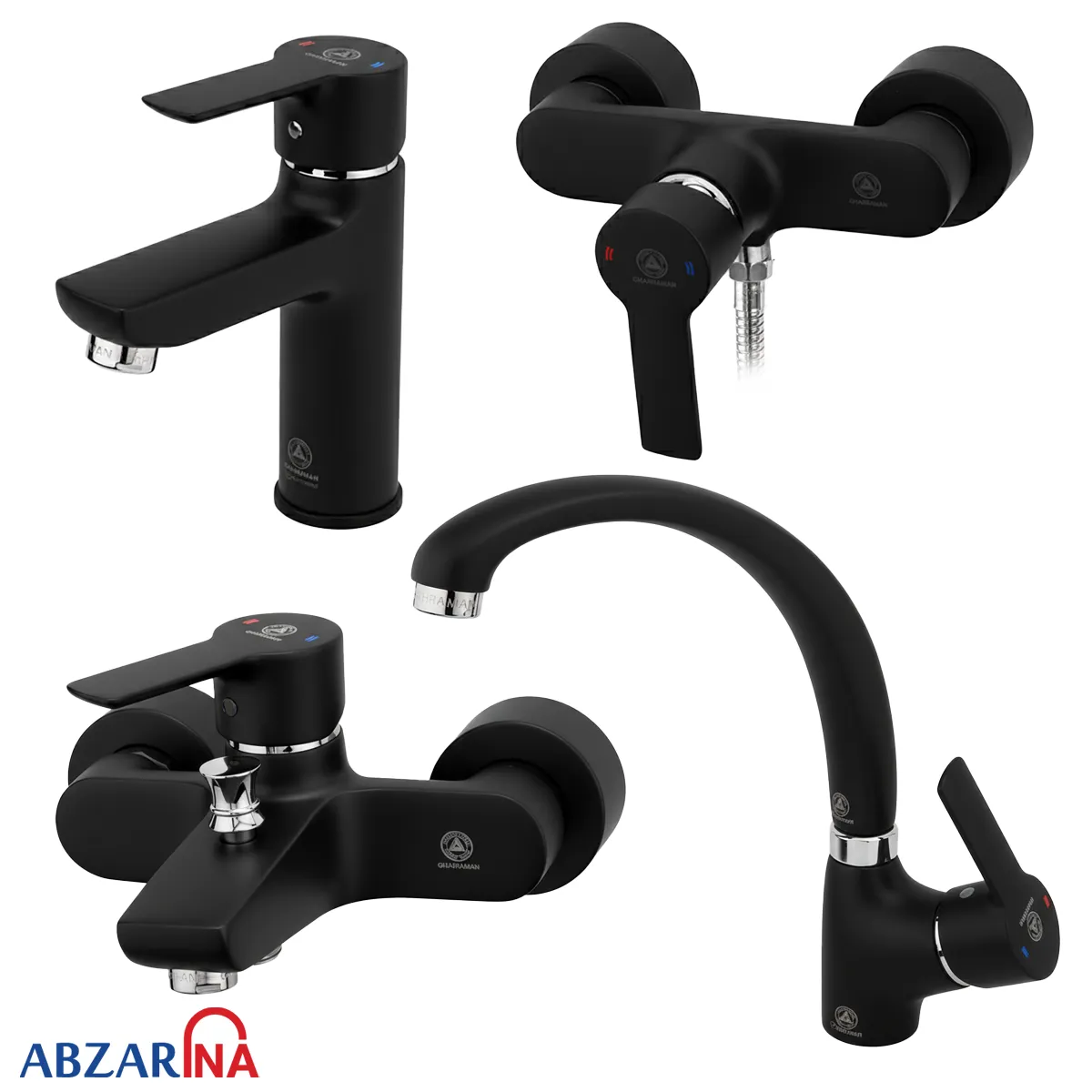 ست شیرآلات یاقوت مشکی قهرمان شامل چهار تکه شیر روشویی، ظرفشویی، آفتابه و دوش مشکی قهرمان است.