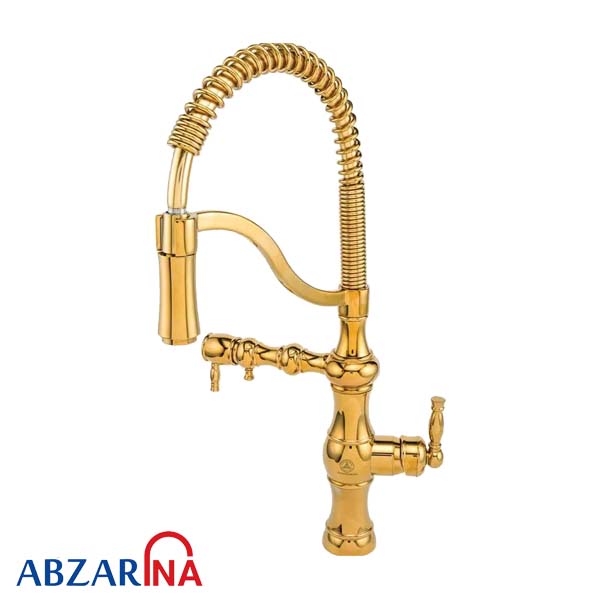 شیر دو منظوره طلایی آنتیک قهرمان دارای علم فنری و قابلیت اتصال به دستگاه تصفیه آب را داراست.