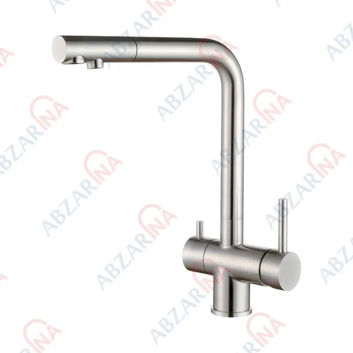 شیر ظرفشویی دو منظوره تتراس کروم مات قهرمان دارای دو اهرم مجزا ، یکی برای آب لوله کشی و یکی برای تصویه تعبیه شده است.